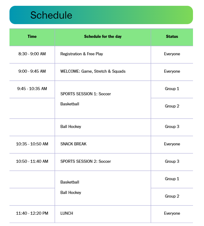 What? Multi-sport day camp with daily Team Talks